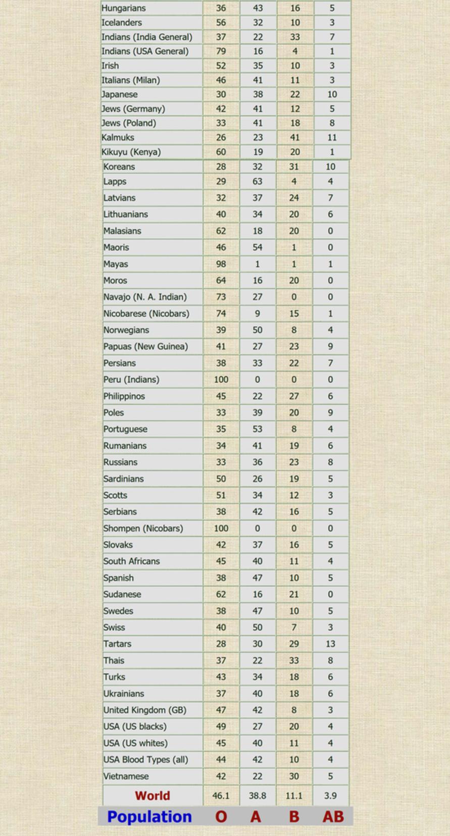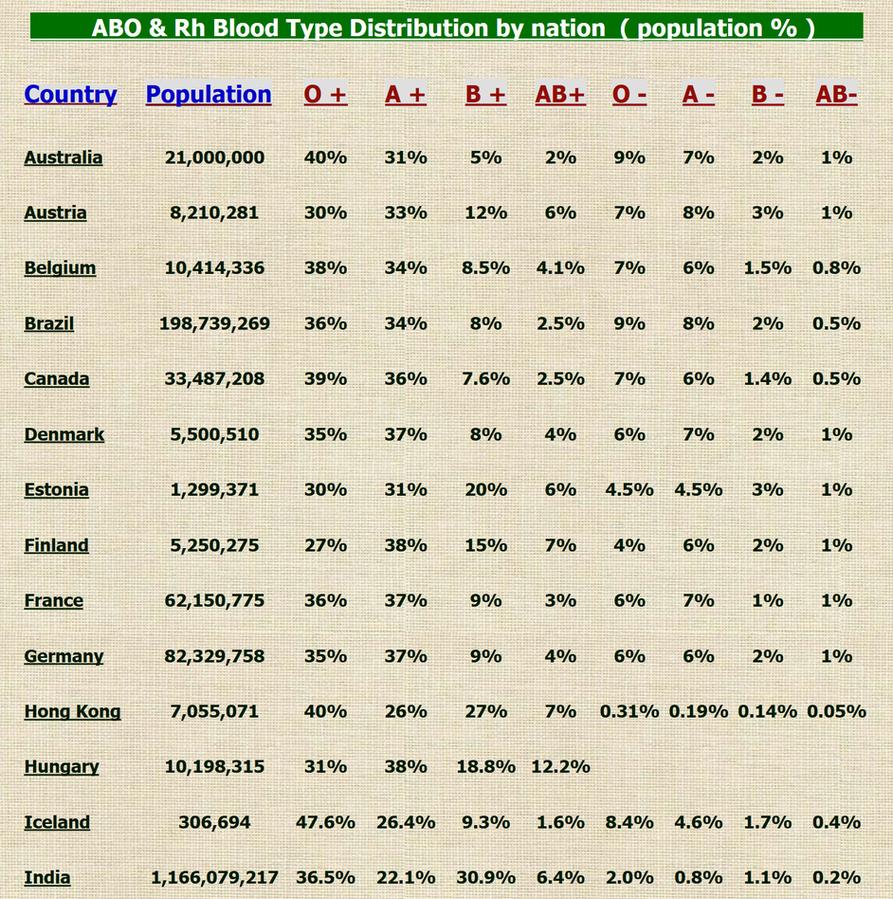 Publishing the ethnic and the racial differences in Blood type is not, in the present-day world, considered to be politically correct. We compile and maintain this database through often times confidential sources. Every Blood gathering entity in the world must gather this information to stay in business, but almost every one of them is afraid to publish the racial and ethnic differences in Blood type, given the emotionally charged political climate